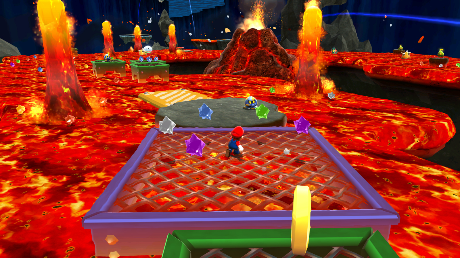 Super Mario Galaxy é um dos poucos jogos do Wii cujo o fato de o console não ter suporte à alta definição não atrapalha muita coisa. Não deu pra entender direito? Bem, em poucas palavras, o que eu quis dizer é que o fato de o Wii não ter gráficos em HD não significa absolutamente nada para Super Mario Galaxy, o jogo continua sendo um dos mais bonitos Wii, fazendo inveja a muitos outros joguinhos em High Definition por aí. SMG fica mais bonito ainda se você tomar como referencial um dos primeiros sucessos do encanador escarlate no mundo tridimensional, Super Mario 64, já que boa parte do jogo — tanto no âmbito visual quanto no das mecânicas de jogo — foi construído tendo o clássico do Nintendo 64 como base. O suprassumo do jogo é também a sua premissa inicial: se aventurar por diversos planetas e galáxias, todas elas belíssimas, diga-se de passagem. Particularmente, a Direção de Arte é a melhor que já vi até hoje (na franquia Mario), e mescla excepcionalmente bem tudo o aquilo que já conhecemos e amamos do universo da franquia à elementos novos, igualmente bem-vindos e igualmente divertidos. As animações não poderiam ser melhores, e processam um grande número de objetos, luzes e personagens na tela sem deixar o jogo lento, ou seja, sem nenhum slowdown. O jogo nem sequer tem telas de loading! Chupa essa, mundo! Não tem como falar dos gráficos de Super Mario Galaxy sem falar do elemento que é, senão o que merece mais atenção, com certeza um deles: o Level Design. Você não está mais se aventurando por pequenas fases que parecem ser claustrofobicamente limitadas. Nada disso, como o próprio nome do jogo propõe, você está se aventurando por galáxias inteiras, viajando entre planetas, estrelas e asteroides. Um medo comum em qualquer fã do bigodudo é que um jogo com uma proposta tão grandiosa como Super Mario Galaxy é que ele seja repetitivo, com fases umas iguais as outras, e, de fato, SMG é sim um tanto repetitivo, mas suas fases não são nem um pouco iguais. Pelo contrário, ainda que todas tenham o mesmo objetivo no final (que é pegar uma Estrela), cada uma delas tem seu próprio ritmo, umas se passando apenas em um pequeno planeta e outras que te dão uma penca de pequenos planetas e te fazem viajar por entre eles, fazendo jus ao título do jogo. Muitas delas trabalham com a transição súbita do 3D para o 2D, e o mesmo vale para o contrário. Uma hora você estará de cabeça pra baixo, em 2D, num grande pote prestes a se encher de areia e te soterrar no meio de um planeta desértico; em poucos segundos, a câmera dá uma guinada pro lado, te põe de volta mundo tridimensional e te joga pro 2D mais uma vez. Isso enquanto você tem que correr contra o tempo (e a areia) pra não ser soterrado. A propósito, essa é uma das galáxias mais irritantes do jogo. No total, SMG tem pra lá de 40 galáxias diferentes, e se você for daqueles que gosta de terminar o jogo com tudo devidamente feito (o vulgo ato de "platinar" o jogo), com certeza jogará a maior parte delas mais de um vez para pegar todas as Estrelas. Se você é um desses, desejo-lhe boa sorte, pois são 120 Estrelas pra você correr atrás.